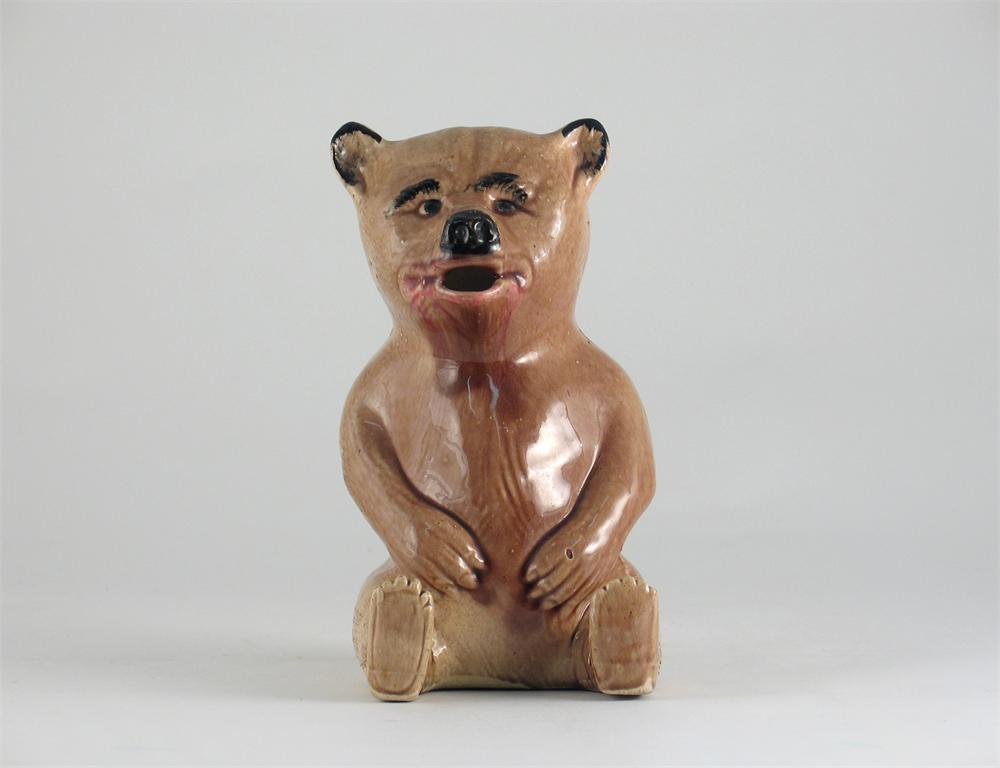 A Majolica bear jug, with a pale brown glaze, the nose, ears and eyes painted black, painted registration and US patent mark, 19th century/20th century, 20cm.