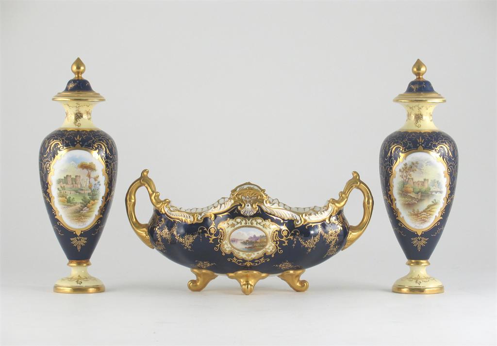 A pair of Coalport vases and covers, painted with scenes of Barnard and Kenilworth Castles signed 'P. Simpson', in gilt-edged panels on a dark blue ground, and a Coalport bowl painted with two landscape panels, one signed 'E. Ball'. Some damages. Early 20th century, 27.5cm. (5)