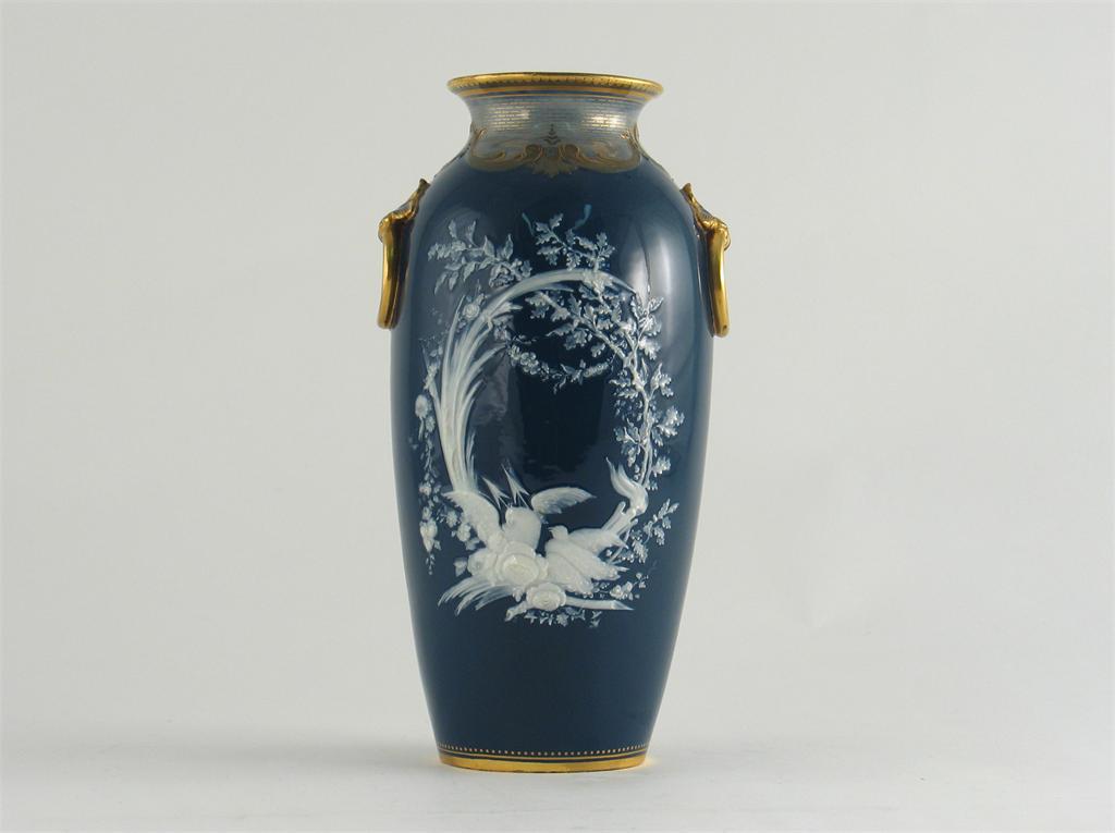 A Minton p?te-sur-p?te vase, depicting two doves, flowers and arrows, beneath a wreath of oak and reeds on a blue ground, applied gilt ring handles, impressed marks, date code for 1876, 24.3cm.