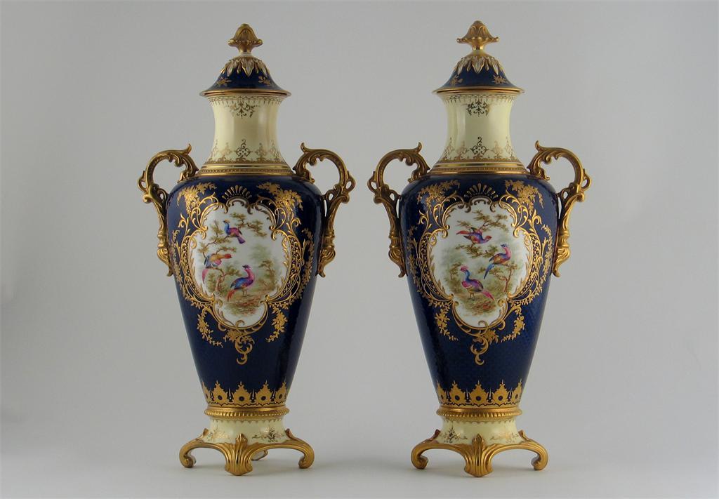 A pair of Coalport twin-handled vases and covers, painted with colourful birds to one side, flowers and fruit to the other, within raised gilt floral panels on a blue-scale ground, printed factory marks and pattern numbers in gilt. Restoration to both. Late 19th/early 20th century, 39.5cm. (4)