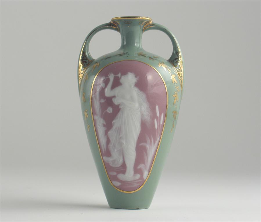 A Thuringia p?te-sur-p?te vase, decorated with a girl standing on a lily pad and drinking from a flower, the sage green body highlighted with gilding, printed marks for Heubach, Lichte. Minor wear to the gilding. 19th century, 14.5cm.