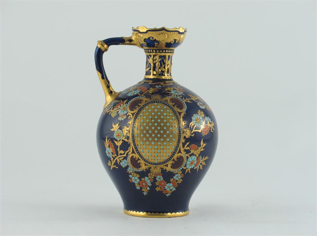 A Royal Crown Derby ovoid jug, richly decorated in raised enamels, turquoise jewelling and gilding on a dark blue ground, printed and incised marks, date code for 1893, 18.5cm.