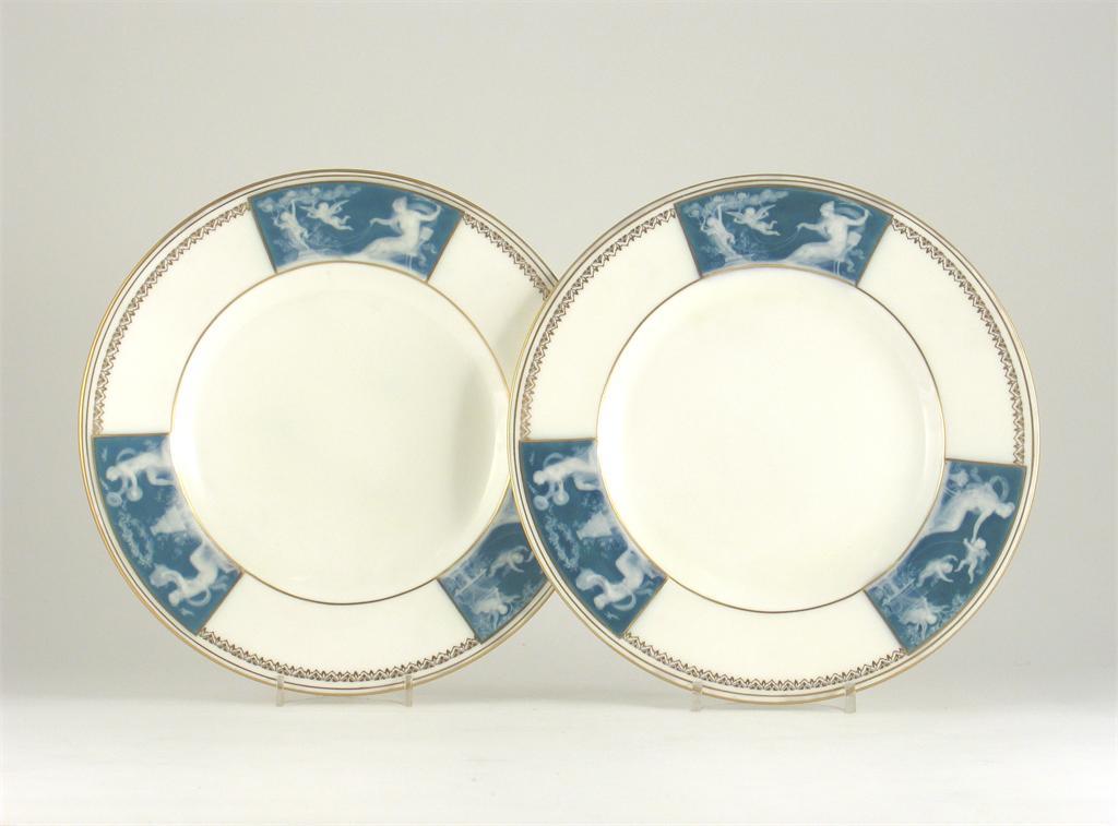 A pair of Minton plates, the borders decorated with three p?te-sur-p?te panels of young girls and cherubs, signed 'AB' and 'A Birks' for Albion Birks. Restored. Late 19th/early 20th century, 27.2cm. (2)