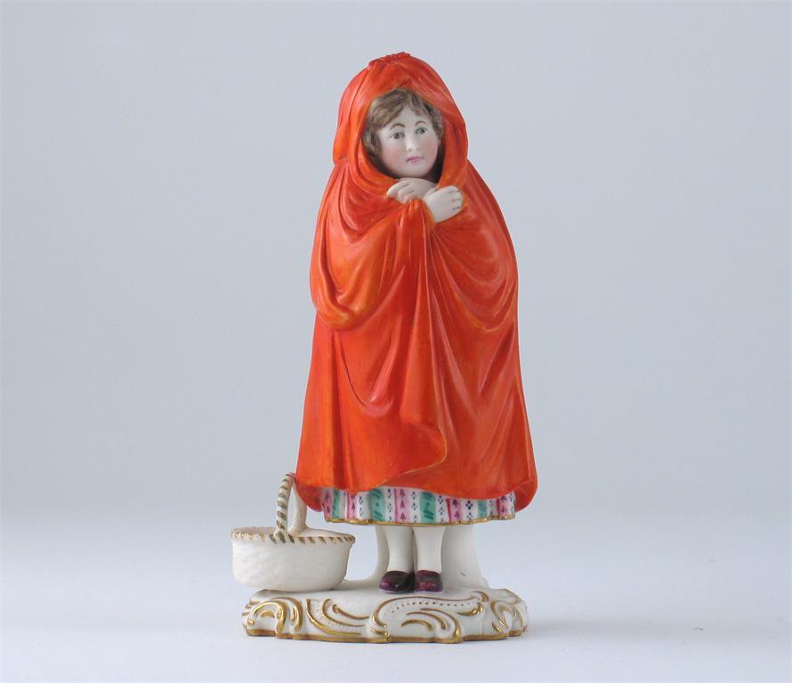 A Minton coloured parian model of Red Riding Hood, standing beside her basket and drawing her cloak around her, impressed mark and date code for 1864. The basket's handle restored. 16cm.