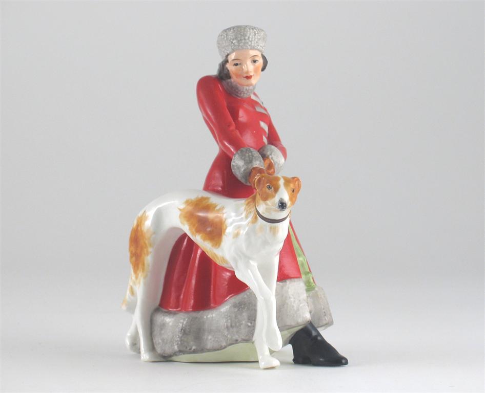 A Royal Crown Derby figure of Olga, wearing a long red fur-lined coat and pulling at the lead of a large dog, printed mark in iron red with date code for 1933, 16.5cm.