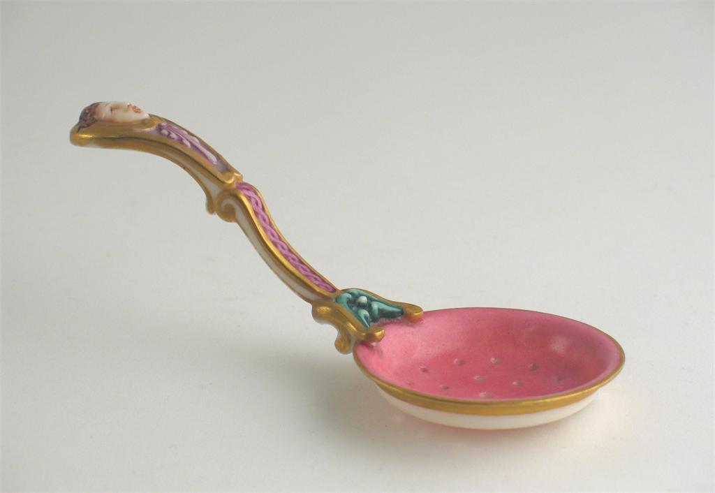 A sifter spoon, the handle moulded with a face, unmarked but probably Royal Worcester, 13cm.