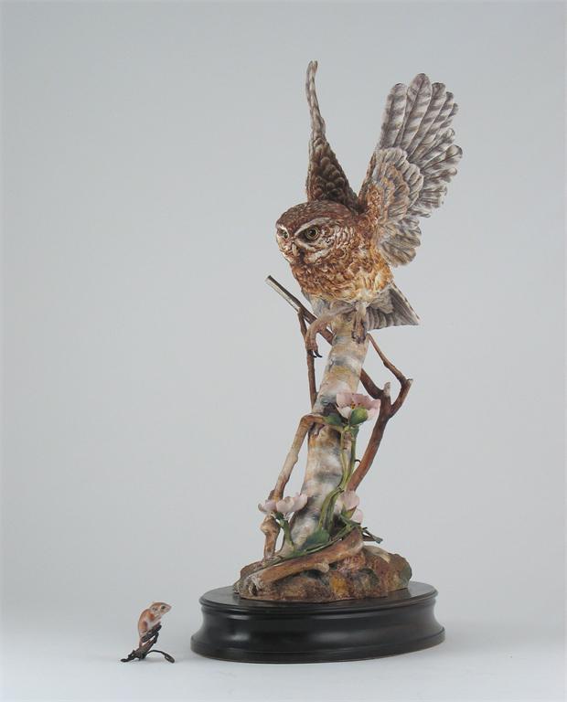 A Hereford bone china model of an owl in flight, above a stump upon which a rose is climbing, raised on a wood stand. A few small chips. Modern, 48cm. Together with a small porcelain mouse. (3)