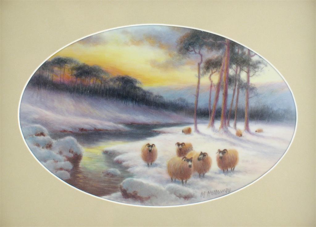 A porcelain oval plaque, painted by Milwyn Holloway, of eight sheep beside a stream in a snowy landscape, framed and glazed, modern, 34cm. overall.