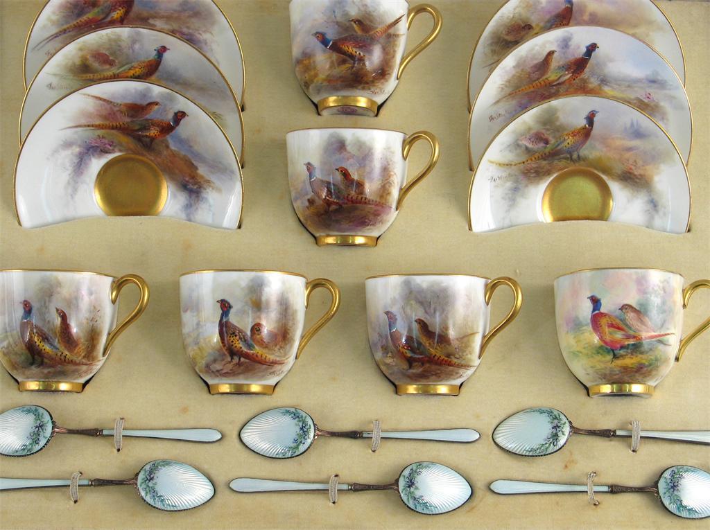 A cased set of six Royal Worcester coffee cups and saucers, painted with pairs of pheasants, five signed 'J. A. Stinton', one signed 'E. Townsend', and six spoons enamelled with pale blue flowers. One cup a later replacement. c.1915.