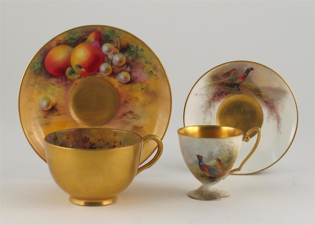 Two Royal Worcester cups and saucers, one painted with fruit, the cup signed 'Townsend', the saucer 'Ayrton', the other painted with pheasants by Stinton. The small cup damaged. Differing dates. (4)