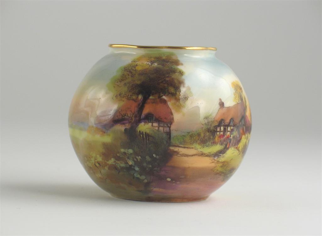 A small Royal Worcester vase, decorated with a scene of cottages and signed, printed marks and 'Wick' painted to the base, date code for 1930, 7.5cm.