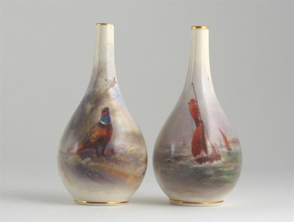 Two Royal Worcester bottle vases, one painted with a pheasant and signed 'Jas. Stinton', the other painted with sailing boats and signed 'H. Stinton'. One with a chip to the rim. Green printed marks and date codes for 1903, 15cm. (2)