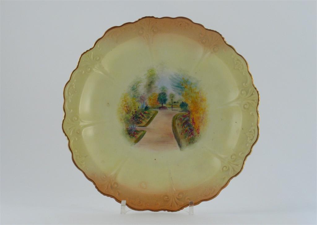 A Locke Worcester plate, painted with a view of the Napier Botanical Gardens, New Zealand, by Walter Stinton, on a matt yellow ground, printed factory mark, c.1895-1900, 23.3cm.