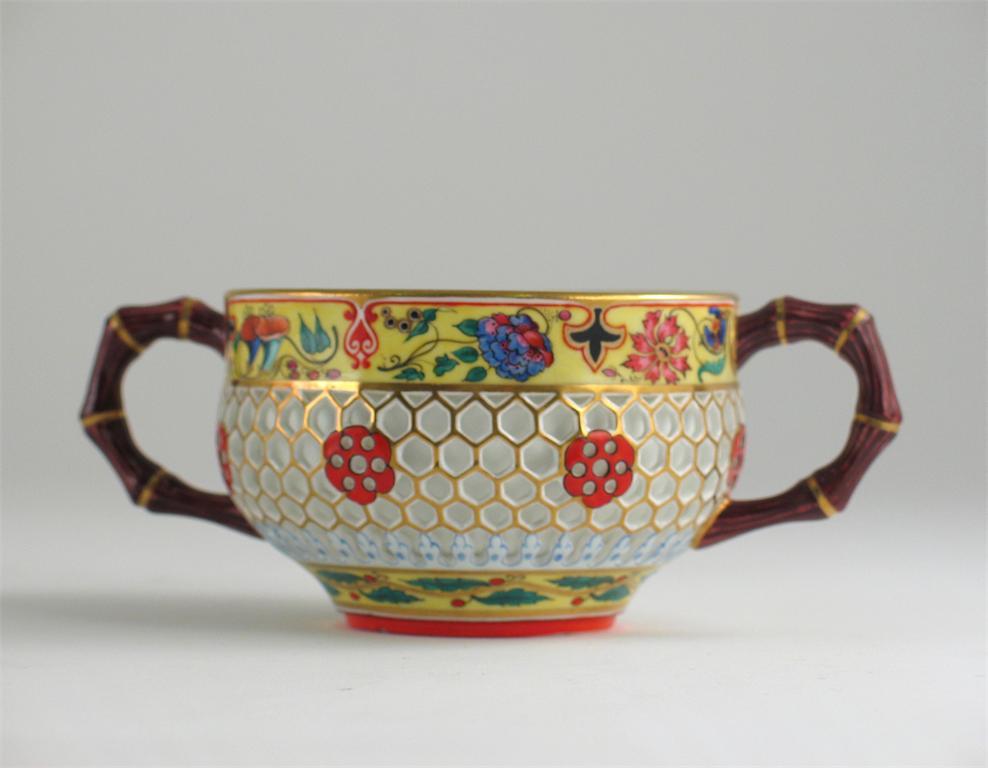 A Chamberlain's Worcester double-walled reticulated sugar bowl, the handles painted as bamboo, painted mark, c.1850, 14cm. Cf. Geoffrey Godden, Chamberlain Worcester Porcelain, p.169 for a similar example.