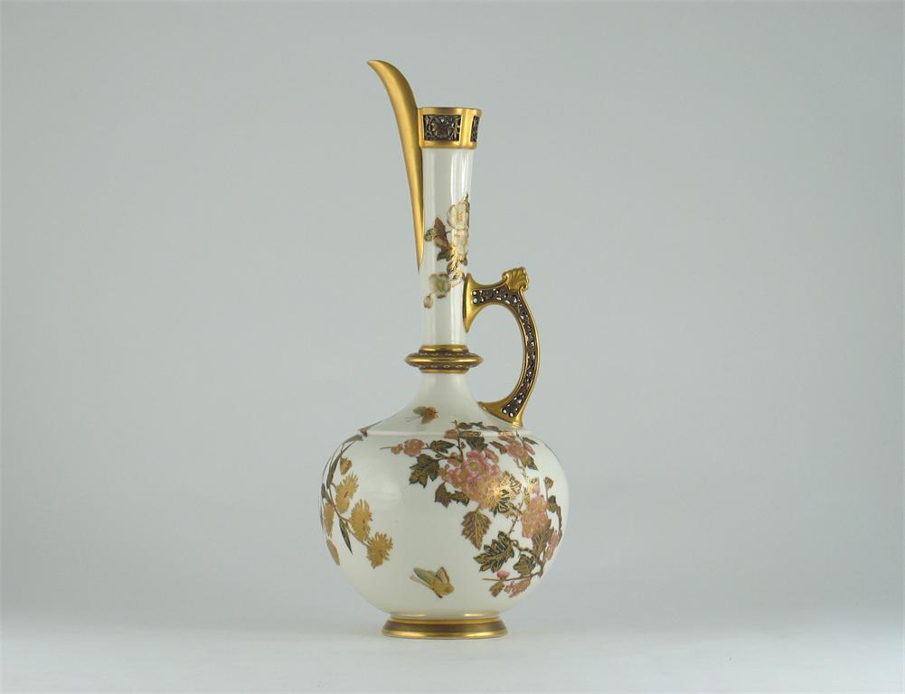 A Royal Worcester 'Persian' shape ewer, decorated with flowers and butterflies on a white ground, the handle gilded and reticulated, printed and impressed marks to base, c.1885, 43.5cm. Cf. Henry Sandon, Royal Worcester Porcelain, Plate 67.