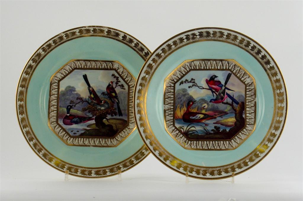 Four Derby plates, each painted with colourful birds in a riverside environment, within a gilt foliate border on a pale blue ground, crowned crossed batons and 'D' marks in iron red. Some wear and scratching. Early 19th century, 22.4cm. (4)