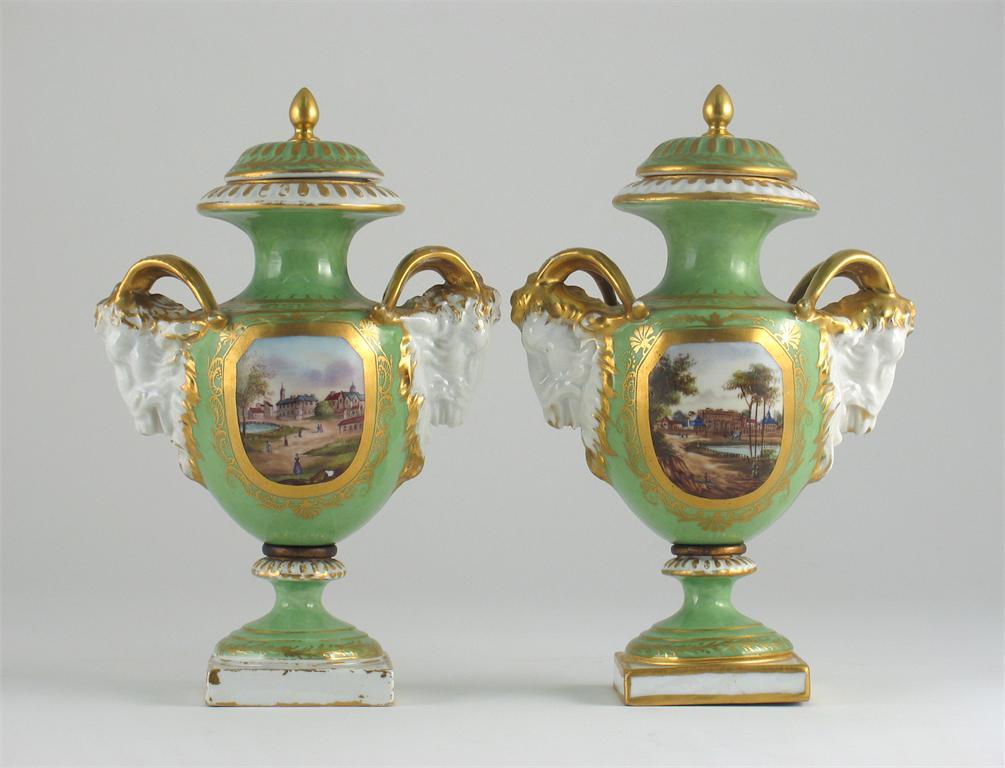 A pair of Continental porcelain vases and covers, one painted with a view of Burlington House, the other The Old Horse Guards, imitation Derby marks. Some wear to the gilding. c.1900, 21cm. (4)