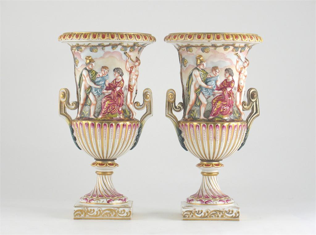 A pair of Continental porcelain campana vases, moulded with classical Roman figures beneath a grapevine, crowned 'N' marks in underglaze blue. Restoration to the handles of one vase. Late 18th century, 29cm. (2)