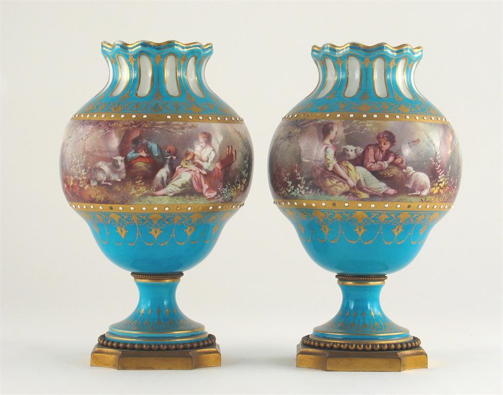 A pair of S?vres-style vases, the ovoid bodies painted with continuous bands of shepherds and landscapes, on gilt turquoise grounds. Wear to the gilding, some jewels lacking. 19th century, 22cm. (2)