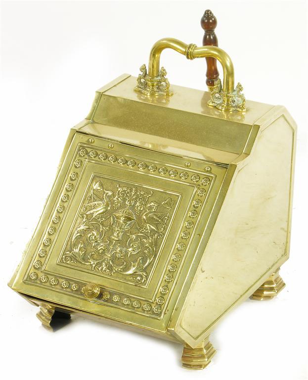 A late Victorian brass coal purdonium, with embossed hinged cover the reverse with a shovel.