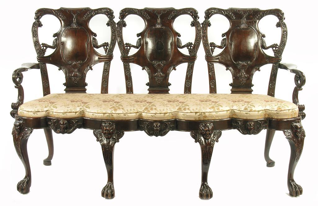 An Irish mahogany triple chair back settee, by M Butler & Co, Dublin, the eagles head top rails above a cartouche shaped splat with carved shells, tassels and grapes issuing feathered taloned legs, the uprights with carved foliage decoration, the scroll arms with birds head terminals on further scroll supports to a shaped front drop-in seat, the frame stamped 'M Butler & Co Dublin,' the frieze carved female and grotesque masks to leaf carved scroll legs with paw feet, 39.75in (101cm) h, 64.75in (164.5cm) w, 24.5in (62cm) d.