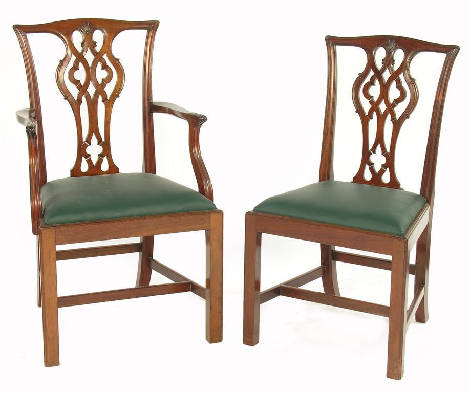 A set of eight mahogany dining chairs, in George III style having pierced and carved five straight splats, two recovered drop in seats comprising, a pair of open arm chairs and six side chairs. Late 19th/early 20th century. (8)