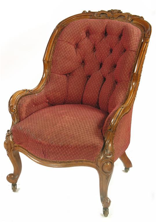 A Victorian carved walnut show frame easy chair