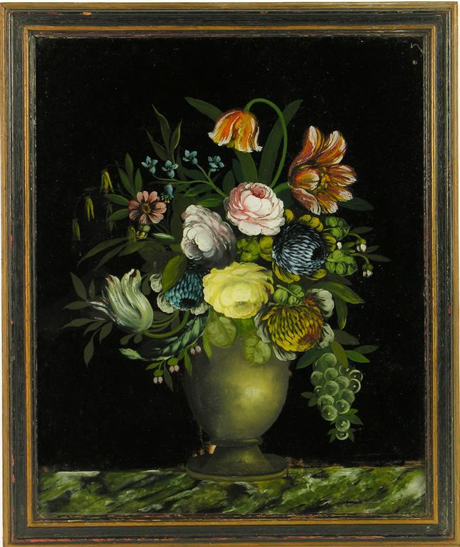 A reverse glass painting, Still Life, a vase of flowers, 16 x 13in (40.5 x 33cm).