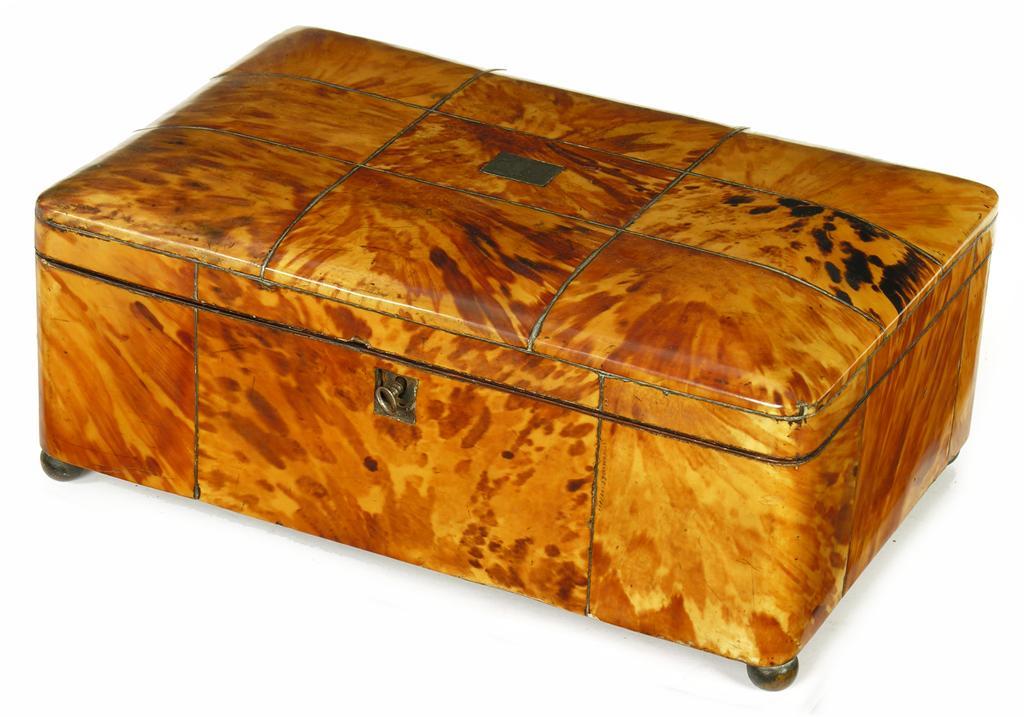 A late Regency blond tortoiseshell work box, with white metal stringing, the hinged lid with an inset plaque to a paper lined vacant interior, on brass ball feet, 5in (12.5cm) h, 12in (30.5cm) w, 8in (20cm) d.