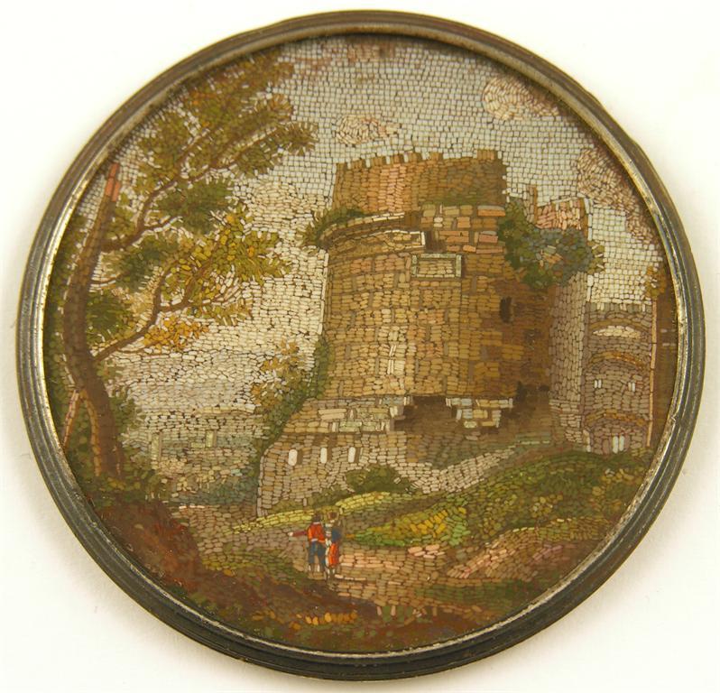 A 19th century micromosaic panel depicting the Tomb of Cecelia Matella, within a silver coloured metal and brass mount, 2in (5cm) dia.