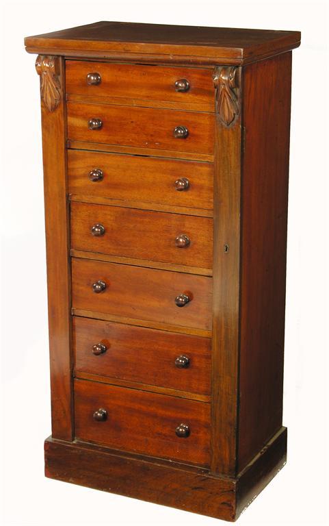 A Victorian mahogany Wellington chest, the seven graduated drawers fitted wood knob handles flanked by leaf carved volutes and a locking pilaster, 41.25in (105cm) h, 20in (50.5cm) w, 13.5in (34cm) d.
