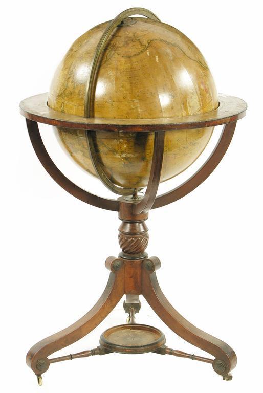 A William IV Newton's Terrestrial globe, with printed segments and a label 'Newton's New and Improved Terrestrial Globe Accurately Delineated From The Observations of The Most Esteemed Navigator's and Travellers To The Present Time, London, Published 1st January 1832, Sold by P. Myers,' 19in dia, the mahogany base with turned ribbed bowl with ebonised moulding on scroll legs united by a compass stretcher, needle, glass and part of paper missing, with brass castors, 43.5in (110.5cm) h.