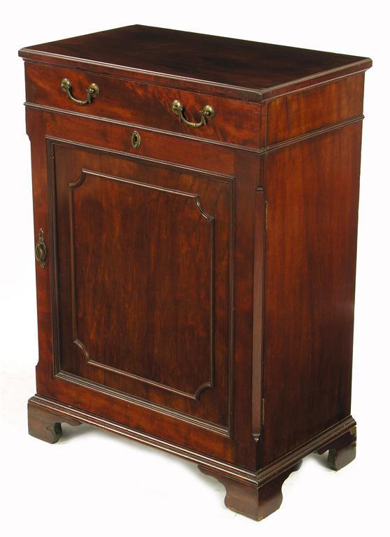 A mahogany cabinet, with a frieze drawer and a panelled hinge door enclosing a shelf on bracket feet, 36.25in (92cm) h, 26.5in (67cm) w, 15.25in (39cm) d. Previously with a raised back.