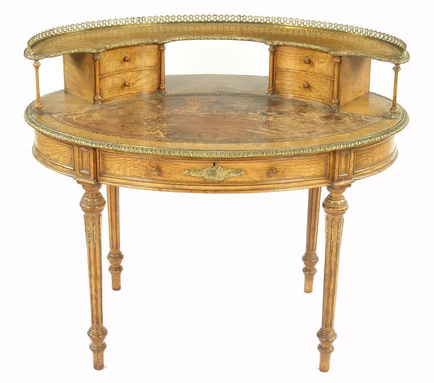 Howard & Sons. A late Victorian oval ash bonheur du jour, with gilt brass mounts, the raised open top with four drawers above a shaped tooled leather inset, the frieze with a central drawer and stamped Howard & Sons, Berners St, on turned fluted legs, the underside with two paper trade labels, 35in (89cm) h, 42in (106.5cm) w, 30in (76cm) d.