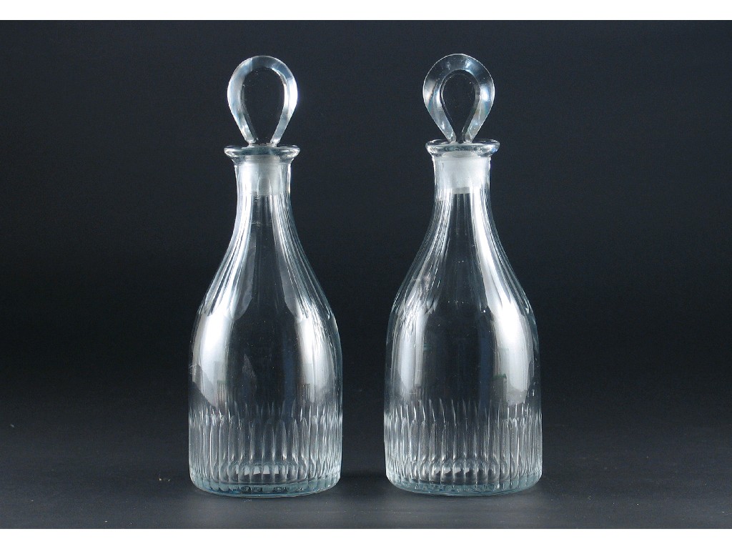 A pair of decanters and stoppers, with faceted shoulders and flutes around the bases, 19th century, 24.5cm. (4)