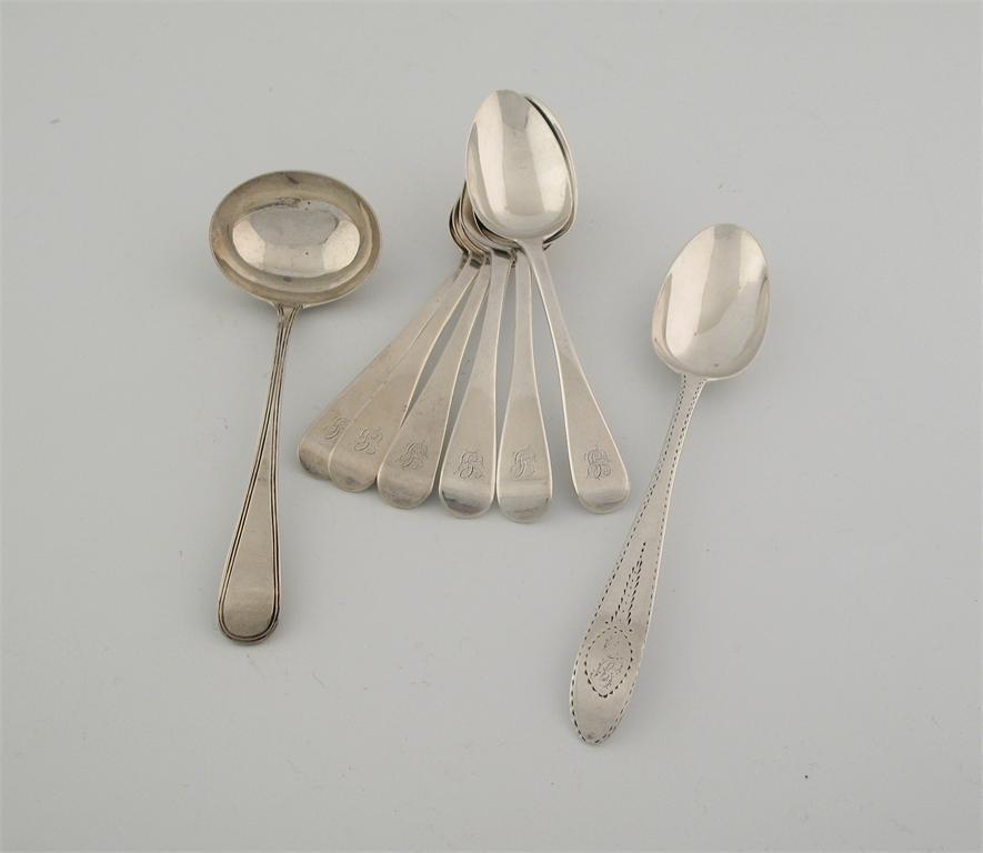A mixed lot: a set of six Victorian Old English pattern dessert spoons, initialled, by S. Hayne & D. Cater, London 1839; together with an Irish bright-cut tablespoon and a thread pattern sauce ladle, 11oz. (8)