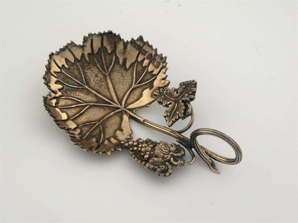 A William IV silvergilt caddy spoon with a tendril handle, vine leaf bowl and a vine leaf and a bunch of grapes on the side of the stem, by Taylor & Perry, Birmingham 1834.
