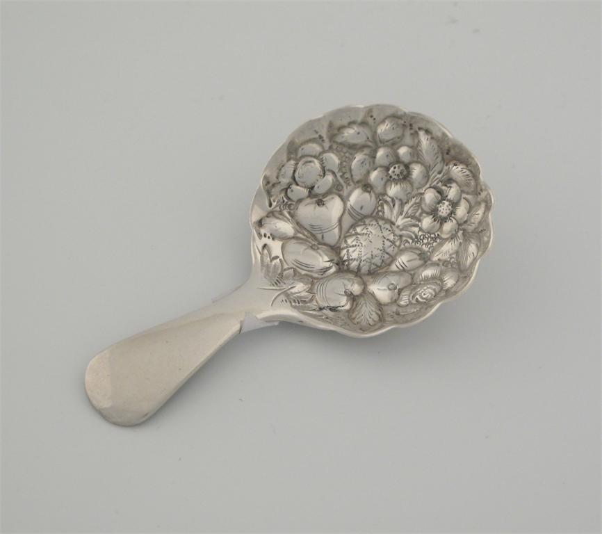 A George III Irish spoon, the bowl embossed with a pineapple, fruit and flowers, by James Scott, Dublin 1814.