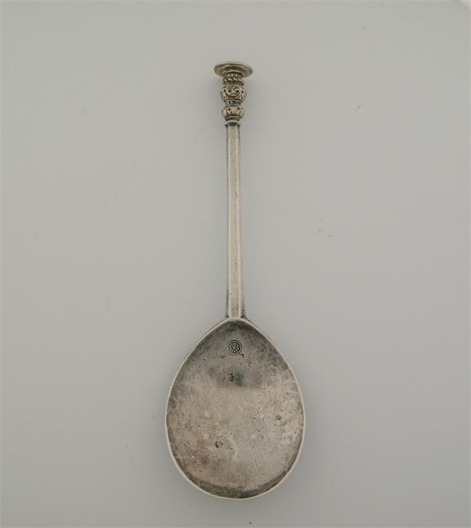 A good Elizabeth I/James I Wessex seal top spoon with a large, gilt, Salisbury 'A' type terminal, pricked 'I.G.' over '1651', struck once in the bowl with a pelleted and segmented circular mark*, by an unascribed maker, Wessex area 1590-1610, 6.9in (17.5cm) long, 1.8oz. * See Jackson's Revised pp. 279 for an illustration of the mark as seen on an apostle spoon c. 1600. See also Kent, T. A.: 'West Country Spoons and Their Makers' for details of the various 'Salisbury' seal castings.