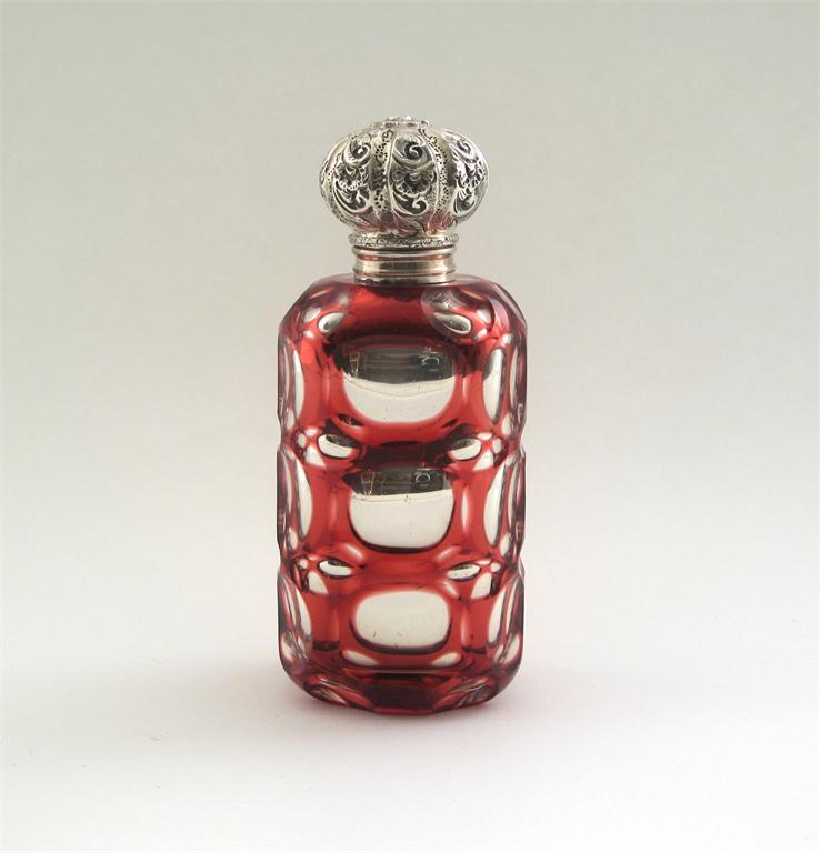 A rare Victorian mounted 'Varnish' glass scent, flashed with cranberry, the embossed cover hinged, revealing a small glass stopper, unmarked c.1850, 4.25in (10.7cm) long.