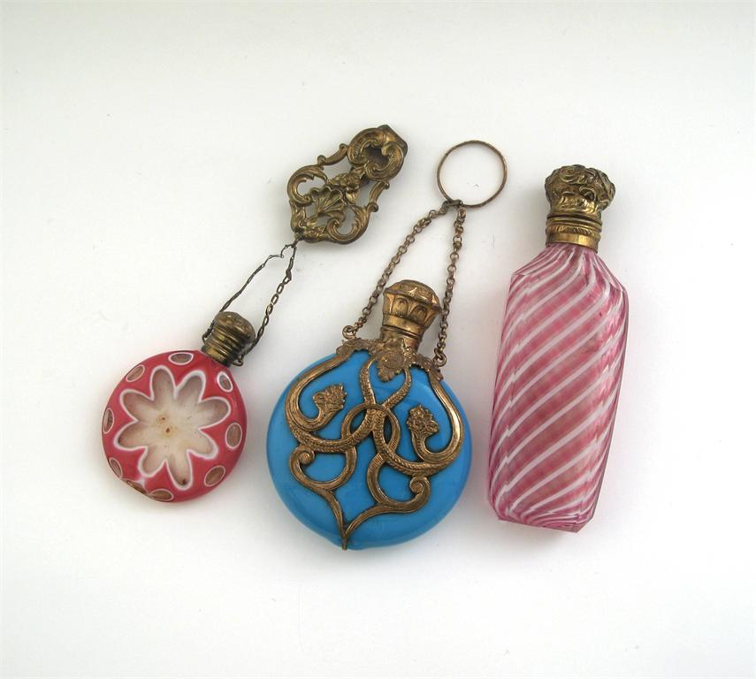 Three Victorian gilt-metal mounted glass scents: a small circular flask, the clear body flashed with pink and white, another slightly larger with overlay and a light blue body, and another with pink and white swirls around the body. (3)