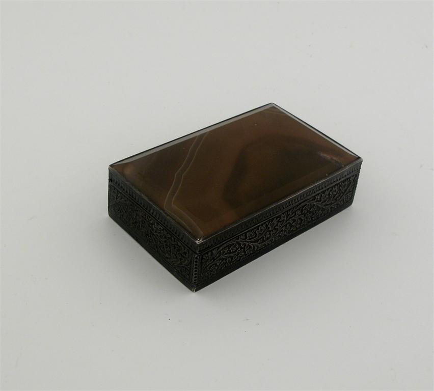 A 19th century oblong box with a hinged cover inset with a bevelled, bonded agate panel, the sides chased with floral decoration, gilt interior, unmarked, probably Indian, 4in (10cm) long.