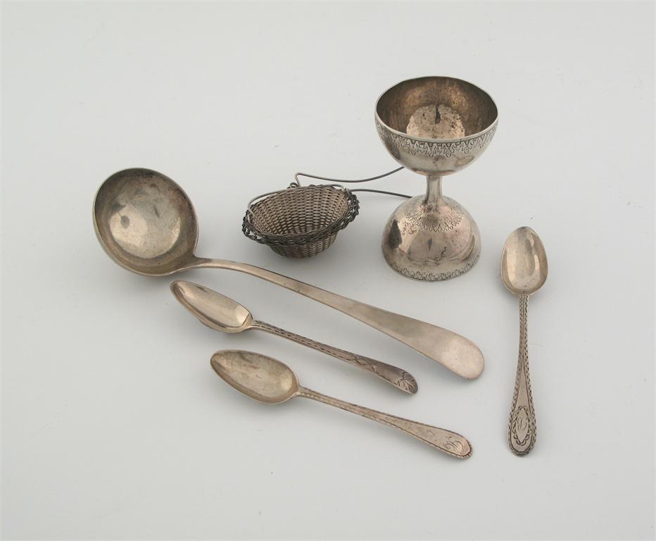 A mixed lot: a Colonial sauce ladle, unascribed, three various Scottish teaspoons, a double-ended cup with engraved bowls, and a wirework strainer for insertion into a teapot spout, 5oz. (6)