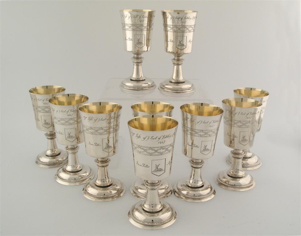 Ten modern commemorative chalices, with a geometric band around the body, inscribed 'Ye gift of ye Earl of Salisbury Chief Steward, 1647' and 'Isaac Poller, Mayor', crested, gilt interior, by Garrard & Co., London, 1972, each bearing limited edition numbers and with certificates. (10)