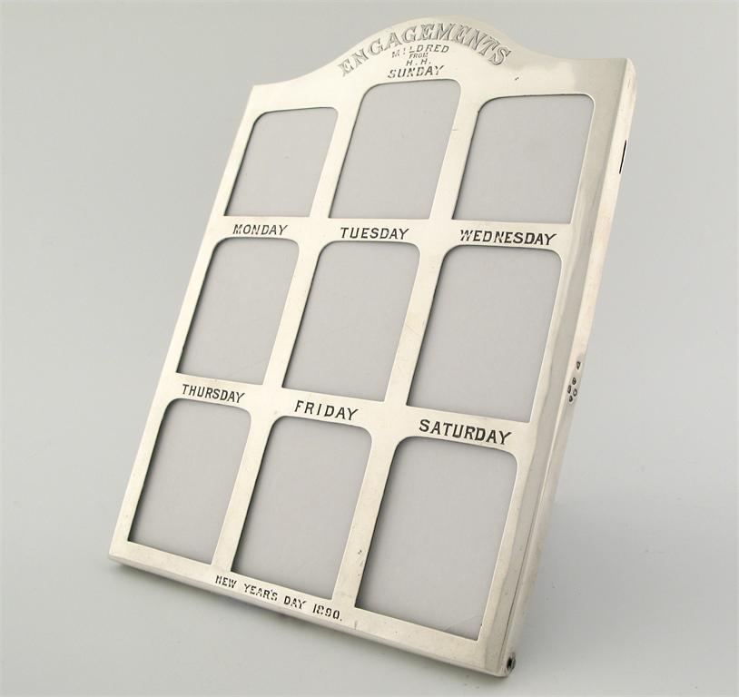 A late Victorian 'ENGAGEMENTS' frame, oblong with an arched top and nine windows, inscribed with the days of the week and 'Mildred from H. H. New Year's Day 1890', (wooden back), by Robert Humphries, London 1889, 11in (28cm) high.