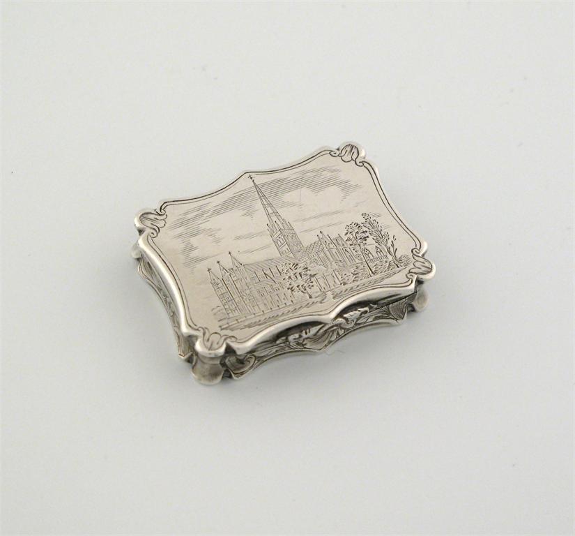 Local interest: a Victorian 'castle top' vinaigrette, with a serpentine edge, engraved with a view of Salisbury Cathedral, by Nathaniel Mills, Birmingham 1843.