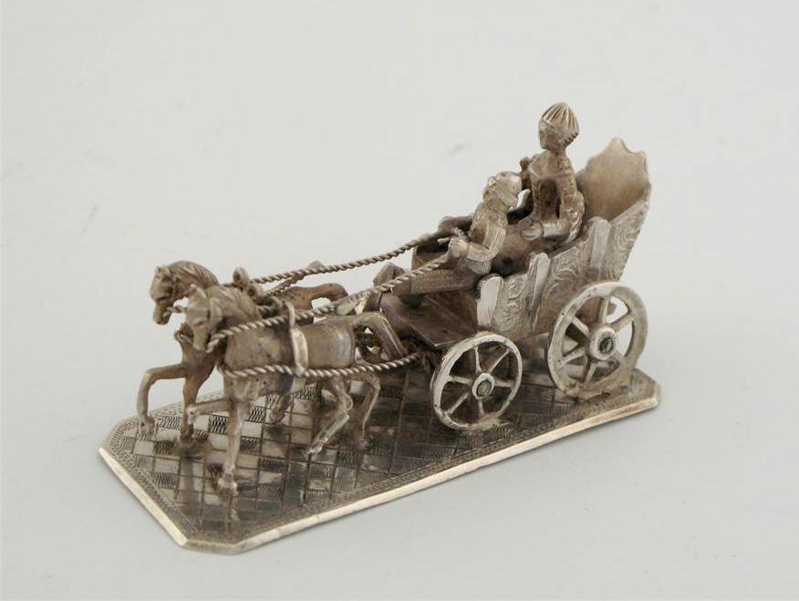 A horse drawn open carriage, with lady passenger and coachman, 2.8in (7.4cm) long.
