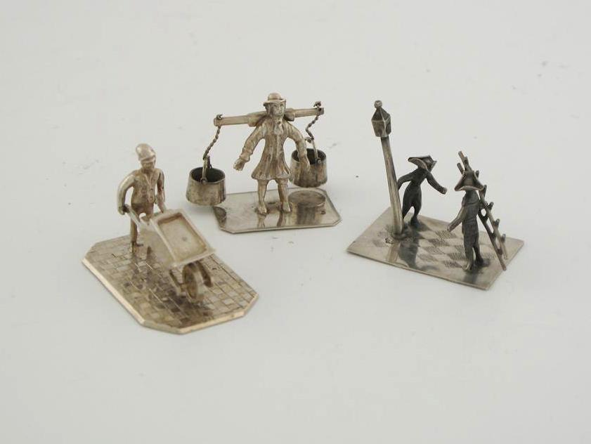 Two lamp lighters in tricorn hats, one holding a ladder; a milkmaid holding a yoke and two buckets; and a young man pushing a wheelbarrow. (3)