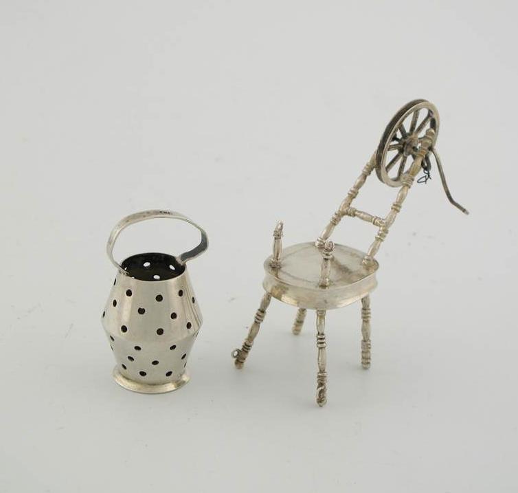 A spinning wheel (a/f) and a vessel pierced with holes on the body and base. (2)