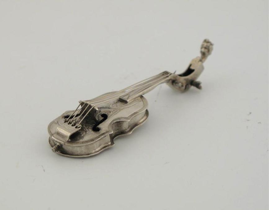 A violin, with realistically formed strings, embossed classical scene on the reverse, 3.5in (9cm) long.